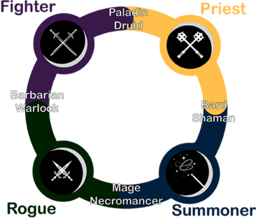 Heroes that has a single role, like Fighter, are fully prepared to it, they have the stats and the habilities to perform in that role but multi-roled heroes need to choose the proper habilities and most likely will have to activate one to be able to perform the selected role(Ex: Druid needs to use the hability Bear Shape to become a proper Tank).